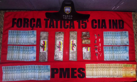 Após realizarem buscas com o cão Messi, os militares tiveram êxito em localizar uma mochila contendo aproximadamente 3,7 quilos de maconha. Todo material apreendido, que totalizou: 03 tabletes grandes de maconha pesando aproximadamente 1kg cada, 01 tablete médio pesando aproximadamente 300g, 02 pedaços de tablete pesando aproximadamente 150g cada, 07 buchas de maconha prontas para a comercialização, 02 pinos de cocaína prontos para a comercialização, 04 pedras de crack prontas para a comercialização e R$7.000,00 (sete mil reais) em espécie, sem comprovação de origem lícita; juntamente a 01 conduzido, foram encaminhados à delegacia para medidas cabíveis.