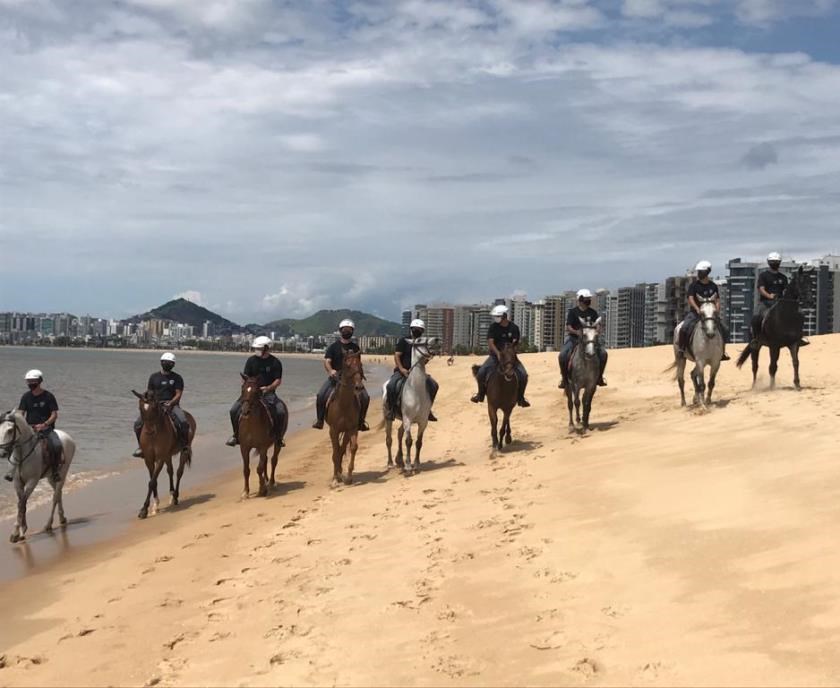 Os oficiais matriculados no curso Gestão de Cavalaria participaram de uma aula diferente na manhã desta quarta (2). A cavalo, eles patrulharam as areias da praia de Camburi para vivenciarem, na prática, as potencialidades do uso dos equinos nos eventos que acontecem à beira mar na Grande Vitória e no interior do estado.