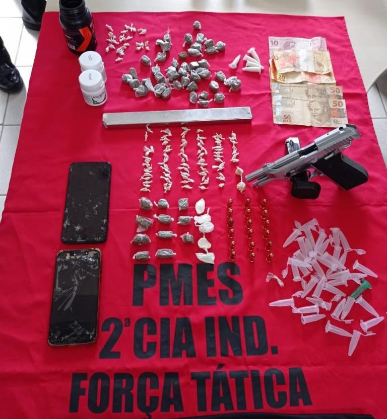De posse de mandados de busca e apreensão expedidos pelo juiz da Comarca, policiais militares da 2ª Companhia Independente e policiais civis da delegacia do município, se dirigiram aos endereços dos suspeitos e, durante as buscas nos locais, apreenderam uma pistola calibre 380, contendo 18 munições, um carregador de metralhadora, 78 pedras pequenas e duas pedras grandes de crack, uma bucha de maconha, cinco papelotes de cocaína, dinheiro e vasto material que era utilizado para embalar e manusear entorpecentes.