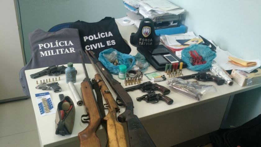 Militares do 13º Batalhão e policiais civis cumpriram diversos mandados de busca e apreensão que resultaram na detenção de C.F.A., 38 anos; E.V.A., 21 anos; R.G., 25 anos; R.G., 30 anos; e R.R.M., 16 anos. Com os indivíduos foram apreendidos três revólveres calibre .38; um revólver calibre .22, uma pistola calibre .635; três espingardas calibre .22; 18 munições calibre .635; 12 munições calibre .38 intactas; uma munição calibre .357; quatro munições calibre .12; três munições calibre .44; uma munição calibre .20; uma munição calibre .32; uma munição calibre. 40; 14 munições calibre .22, além de vários produtos roubados de propriedades rurais do município.