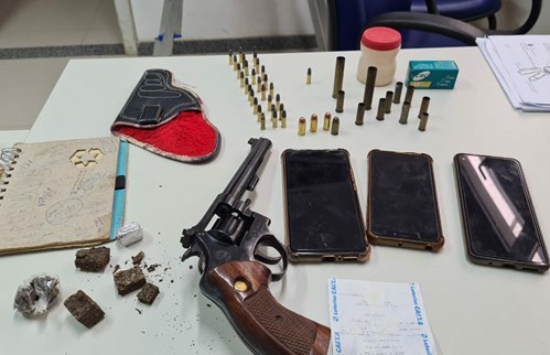 Também foi apreendido um revólver calibre 22, municiado com seis cartuchos; 33 munições entre calibres 22 e 380; seis buchas de maconha, 11 cartuchos deflagrados de diversos calibres, um coldre de revólver e uma caderneta contendo anotações relacionadas ao tráfico de drogas.