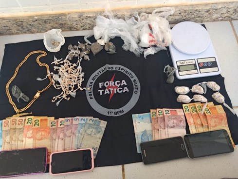 Na ocasião foram localizadas e apreendidas 361 pedras de rack, 20 buchas de maconha, balança de precisão, seis aparelhos celulares utilizados para comunicação do tráfico, R$636,00 reais em dinheiro e cinco pessoas conduzidas à Delegacia.