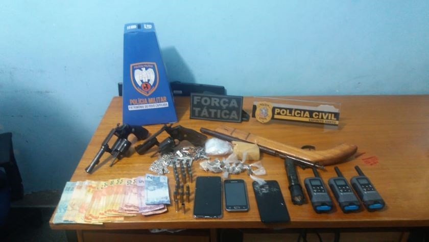As equipes compostas por 31 policiais militares e nove policiais civis apreenderam no município três armas de fogo, 24 munições de diversos calibres, três rádios comunicadores, duas motocicletas usadas no tráfico de drogas, 20 buchas de maconha, um tablete pequeno de maconha pesando 85 gramas, uma pedra grande de crack, material para embalo de drogas, além de R$ 1.147,00 em espécie.