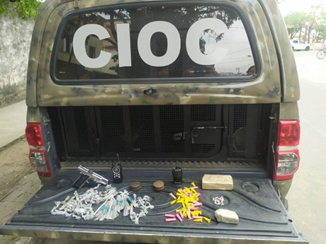 Primeiramente o cão “Jhingo” localizou em um barranco, na parte alta da rua, 136 buchas de maconha, dois tabletes da mesma droga (de aproximadamente 550 gramas) e dois rádios de comunicação. Posteriormente, o cão “Eudis” localizou na parte baixa da rua, debaixo de uma laje mais 14 pedras de crack, 50 pinos de cocaína, uma pistola marca Taurus calibre 380, com carregador e 10 munições calibre 380 intactas.