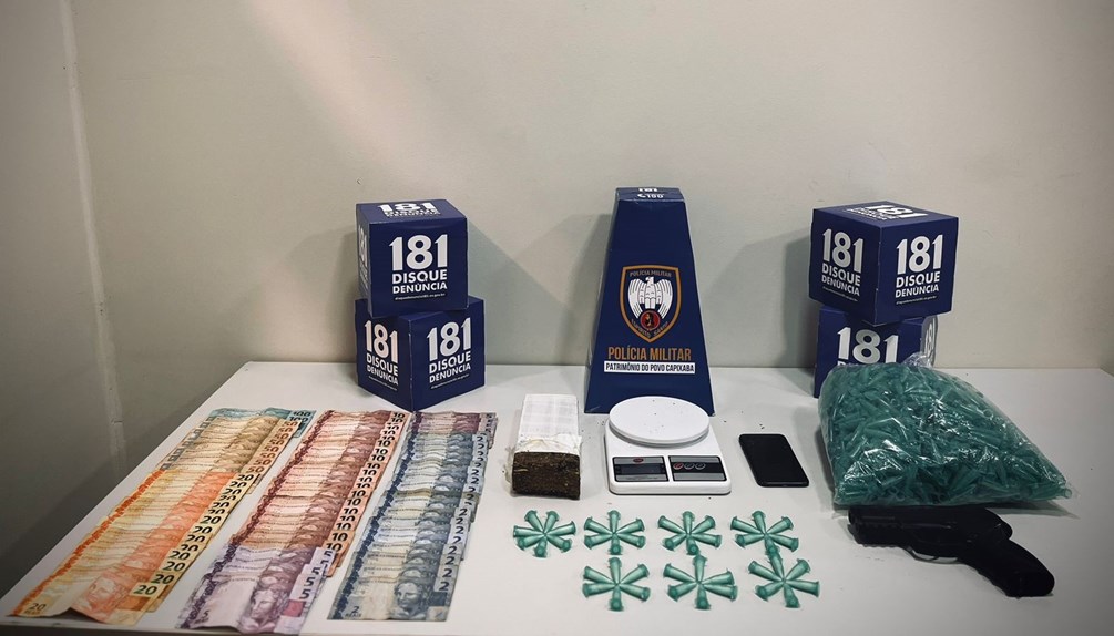 No bairro Aeroporto um suspeito de 34 anos foi preso portando uma pistola calibre.40, 31 munições de mesmo calibre, três carregadores de pistola, R$ 26.818,00 reais em espécie, $10,00 Euros, $ 36,00 Dólares, um colete balístico, uma maleta de pistola, quatro frascos de ácido bórico, dois celulares, material de embalo de entorpecentes e dois cadernos com anotações do tráfico.