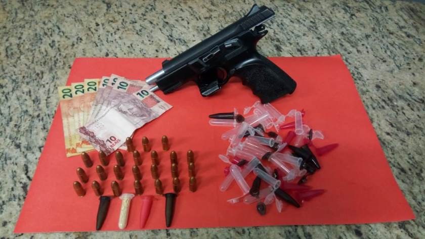 Durante patrulhamento pelo bairro União, militares abordaram um homem suspeito e encontraram em sua cintura uma pistola calibre 9 mm com numeração suprimida e municiada com 15 munições intactas. Além disso, com ele foram apreendidos quatro pinos de cocaína, um aparelho celular e R$ 100,00 em espécie. Após buscas no local onde ele estava foram localizadas mais nove munições do mesmo calibre da pistola e 37 pinos vazios. O criminoso foi preso em flagrante.