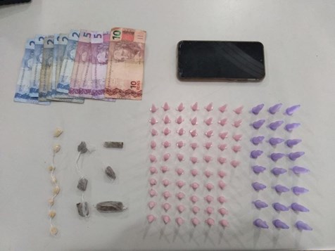 Durante policiamento, a Patrulha da 1ª CIA visualizou um suspeito e o abordou, encontrando com ele uma bolsa contendo entorpecentes, sendo seis buchas de maconha, oito pedras de crack e 89 pinos de cocaína, além de um aparelho celular e R$ 47,00 em espécie.