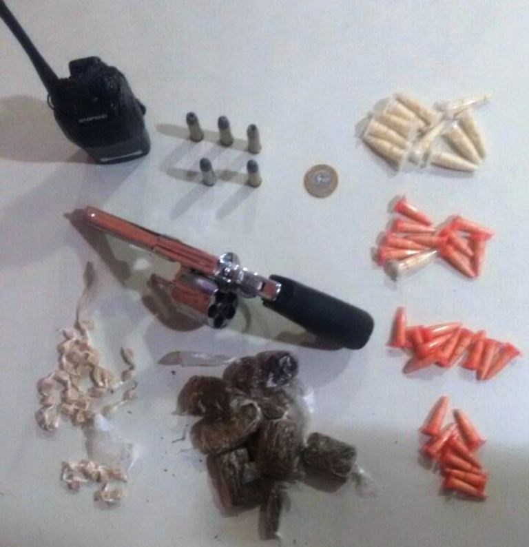 No bairro Forte São João, militares faziam patrulhamento na região conhecida como “Cruzeiro” e avistaram dois suspeitos. Eles tentaram fugir ao perceberem a guarnição. Um deles foi alcançado e identificado como W.F.P., de 20 anos. Com o abordado foi encontrada uma bolsa contendo 37 pedras de crack, 36 pinos de cocaína, 10 buchas de maconha, um revólver calibre 38 com cinco munições intactas e um rádio comunicador.