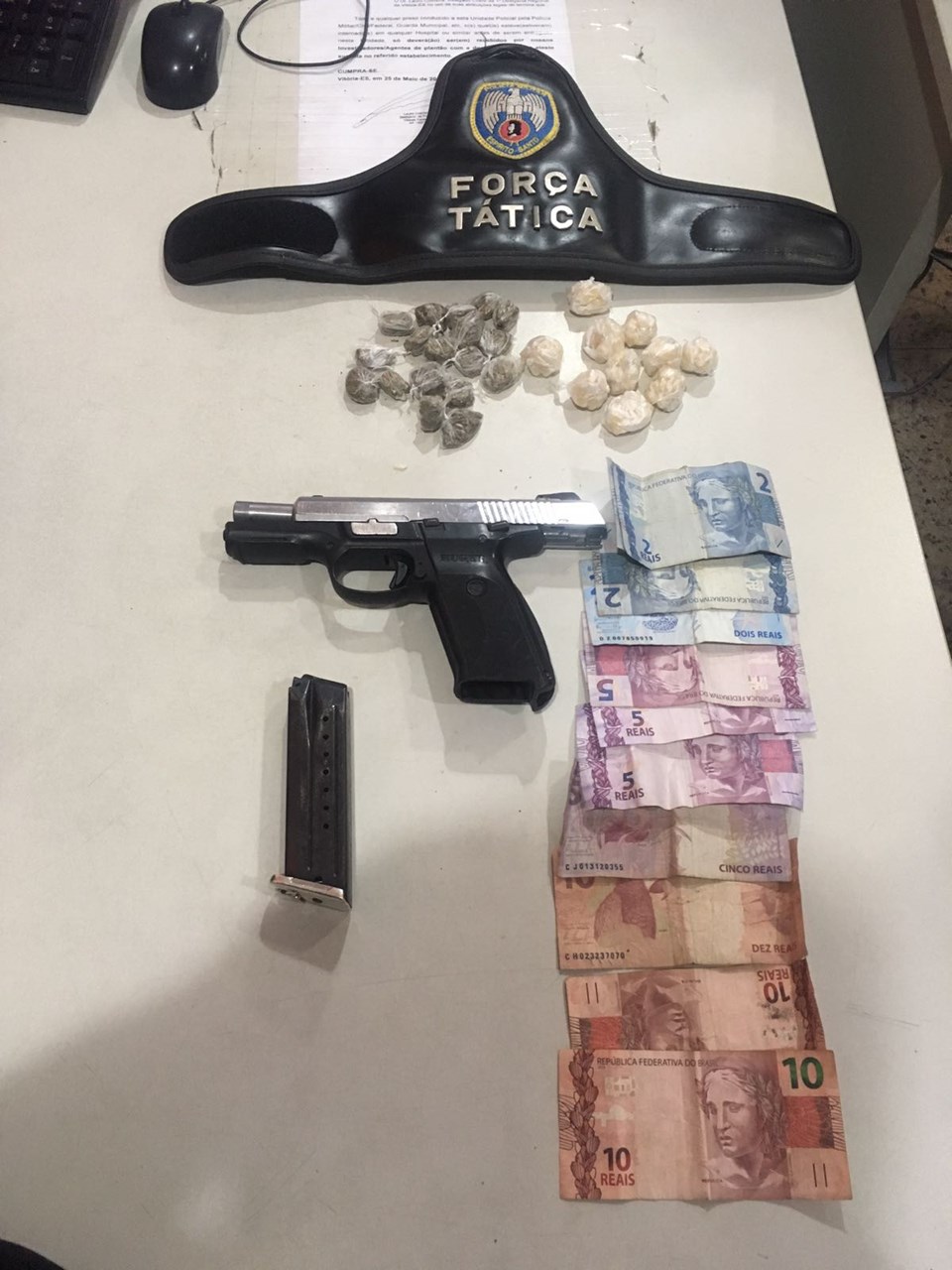 Militares da equipe de Força Tática do 1º Batalhão apreenderam nesta quinta-feira (23), durante patrulhamento desembarcado no bairro Ilha do Príncipe, em Vitória, uma pistola de fabricação americana, drogas e dinheiro.
