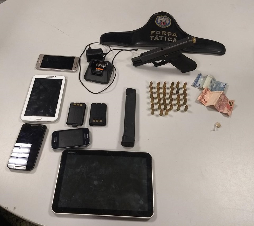 Durante buscas pelo local, os policiais puderam encontrar e apreender os seguintes materiais: uma pistola Glock 9mm, com dispositivo seletor de rajada, um carregador alongado com capacidade para 31 munições, 33 munições calibre 9mm, quatro aparelhos celulares, um tablet, uma base e duas baterias de rádio comunicador, uma pedra de crack e R$ 12 em espécie.