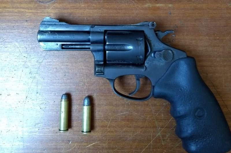 Após busca pessoal nada de ilícito foi encontrado, entretanto, durante busca no quintal foi encontrado um revólver calibre 357, com numeração raspada e duas munições intactas, uma de calibre 357 e outra calibre 38, que o suspeito assumiu ser de sua propriedade.
