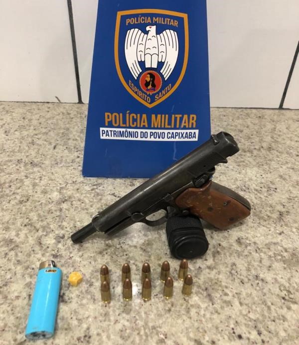 Durante busca pessoal foi localizado em posse do abordado a arma de fogo, munições e a substância ilícita. Ele foi apreendido e encaminhado com os materiais recolhidos ao plantão policial.