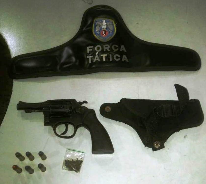 Em posse do carona, identificado como L.P.N.R., 19 anos, foi apreendido um revólver Taurus calibre 38, carregado com seis munições intactas e também um embrulho de maconha. O condutor do veículo que não possuía habilitação foi autuado pelas infrações cometidas.