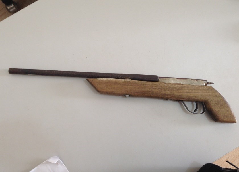 Uma “espingarda trabuco", de fabricação caseira, sem estar municiada, foi apreendida no local. R.N.V.S. estava do lado de fora da residência e assumiu ser o dono e fabricante a arma.