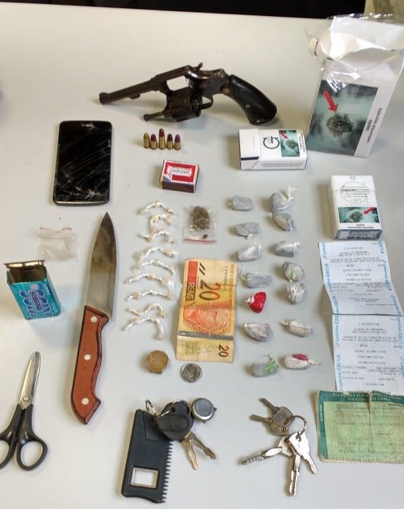 Enquanto realizavam cumprimento de mandado de busca e apreensão em uma residência, já tendo localizado uma sacola contendo 15 buchas de maconha e 27 pedras de crack em seu interior, os militares receberam uma denúncia anônima de que, momentos antes da entrada policial no imóvel, um dos suspeitos havia jogado uma arma de fogo pela janela do imóvel, que estaria em um lote ao lado do prédio. No terreno, havia um revólver calibre 32 carregado com cinco munições intactas. Os suspeitos confessaram a posse da arma.
