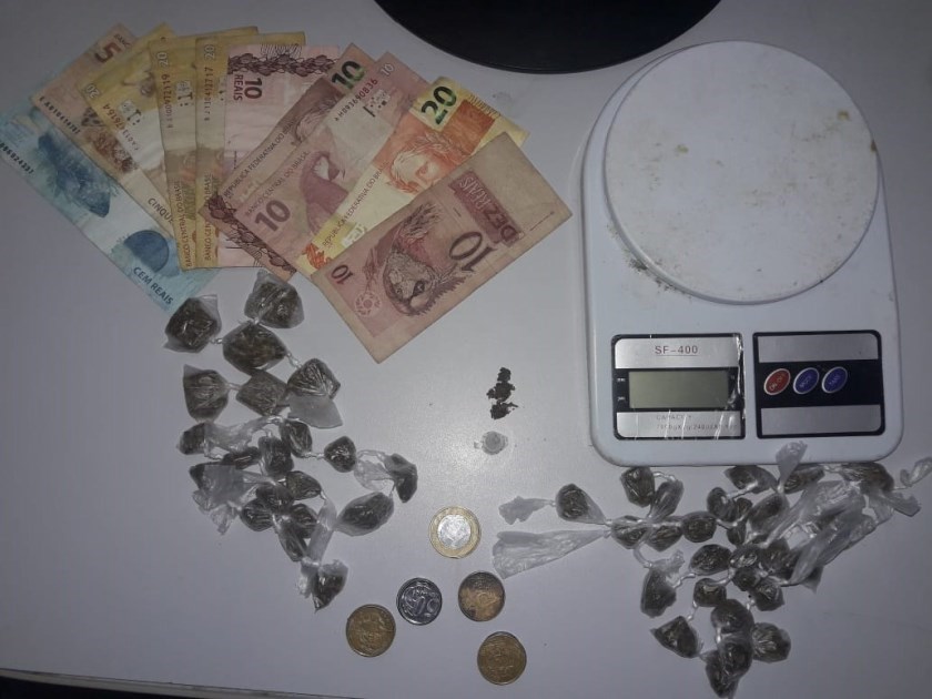 Em Fundão, por volta das 21 horas, a equipe da RP 3653 recebeu denúncia anônima informando que um casal estaria praticando tráfico de drogas em uma construção abandonada na localidade de Praia Grande. Ao se aproximar do local, a equipe visualizou o casal suspeito que, percebendo a presença da viatura, fugiu para os fundos do imóvel. Os militares acompanharam e, em primeiro momento, abordaram a mulher, identificada como J.N.R., 31 anos. Com ela, foram encontrados R$ 26,00 em espécie e um pino de cocaína. Durante as buscas, G.P.F., 22 anos, foi localizado escondido dentro de uma caixa d’água vazia que estava no quintal. Com ele foram apreendidos R$ 250,00 em espécie e seis buchas de maconha. Ao lado da caixa d’água, a guarnição encontrou outras 40 buchas de maconha e uma balança de precisão.