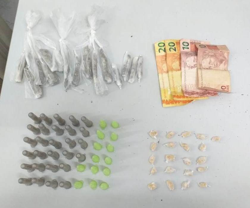 Já na quinta-feira, militares da moto patrulha visualizaram uma mulher escondendo uma sacola embaixo de um veículo. Na abordagem, foram encontrados no interior da sacola 42 pinos de cocaína, 21 pedras de crack, 15 buchas de maconha, além de R$ 60,00 em espécie.