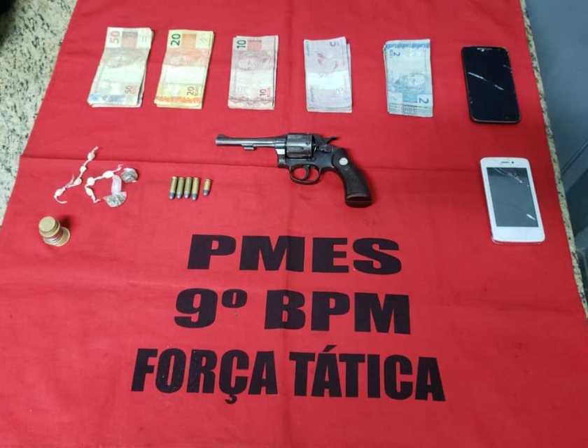 Militares do 9º Batalhão da Polícia Militar apreenderam drogas, dinheiro e um revólver calibre 38. Os materiais foram localizados com três homens, na Rua Mariano Bueno, no bairro Amaral, em Cachoeiro de Itapemirim. A ação foi na madrugada deste domingo (14).