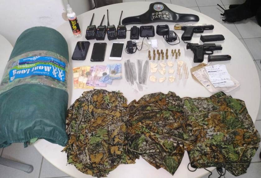 Como resultado da operação, foram apreendidos uma pistola Glock calibre 40, uma pistola Taurus calibre 380, dois carregadores, 22 munições, duas calças e uma camisa camuflada, 10 buchas e seis pinos de cocaína, cinco buchas de maconha, quatro rádios comunicadores, três aparelhos celulares, R$86 em espécie e itens diversos.