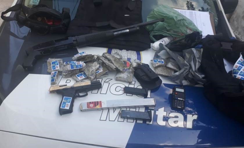 Uma equipe realizava patrulhamento na região do bairro Tabuazeiro quando receberam uma denúncia informando que dois imóveis estavam sendo utilizados para o tráfico de drogas. As equipes seguiram aos endereços informados e após verificação da denúncia apreenderam diversos materiais. Na ação foram apreendidos uma espingarda calibre 12, uma pistola 9 mm, um colete balístico, 37 munições calibre 12 intactas e uma deflagrada, 14 munições 9 mm, um carregador alongado 9 mm, um carregador calibre 380, 27 buchas de maconha, 70 pinos de cocaína, duas balanças de precisão, três aparelhos celulares, um coldre de pistola, cinco radiocomunicadores, nove bases para carregamento, 11 caixas de fogo de artifício e materiais para embalo de entorpecentes. Nenhum suspeito foi detido.
