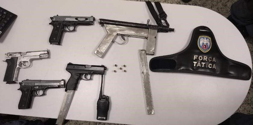 Em outras ações realizadas na área da Unidade, foram apreendidos uma pistola Taurus PT52S, uma submetralhadora de fabricação caseira, quatro simulacros de arma de fogo, 102 buchas de maconha, 120 pinos e quatro papelotes de cocaína, 89 pedras de crack, uma balança de precisão, um rádio comunicador e R$ 71,00 em espécie. Quatro pessoas foram detidas.