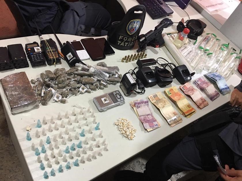 Na região do Morro da Floresta, no bairro Gurigica, equipes da Força Tática realizaram um cerco ao local na noite de sexta-feira (12), e avistaram diversos indivíduos que portavam rádios comunicadores e armas. Três pessoas foram detidas, resultando na apreensão de uma pistola Taurus PT 838 com mira a laser acoplada, dois carregadores, 15 munições, três rádios comunicadores, 68 pinos de cocaína, 75 buchas de maconha e um tablete de maconha, 43 pedras de crack, 16 lança perfumes cheios e 26 utilizados, um frasco de éter, R$ 1.864,00 em espécie, além de outros materiais utilizados pelo tráfico de drogas.