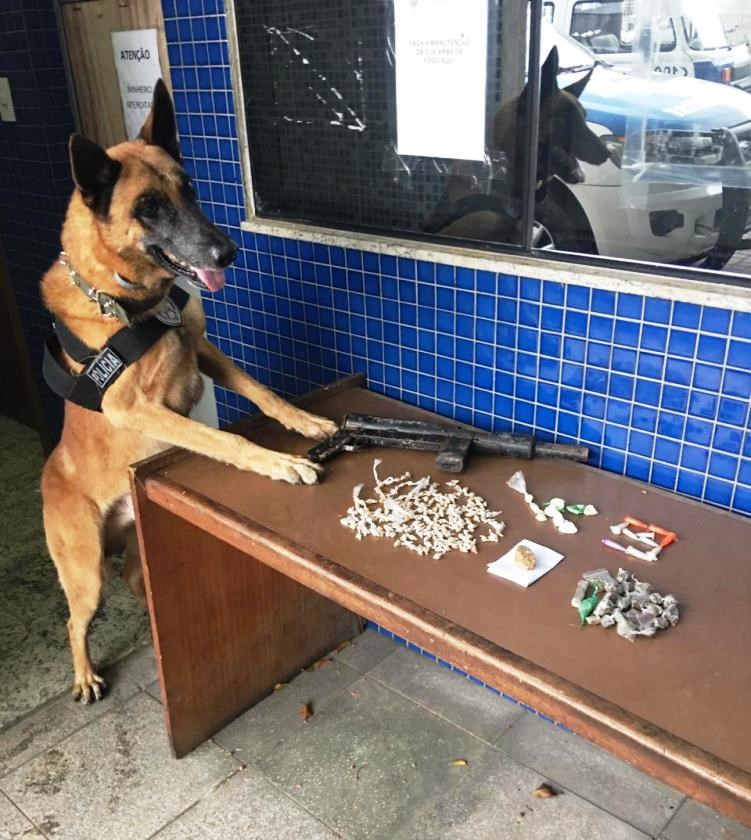Já no bairro Feu Rosa, a equipe K9 da Companhia realizava o patrulhamento tático motorizado em uma mata quando localizou uma arma de fogo de fabricação caseira calibre 12, 25 buchas de maconha e 223 pedras de crack. Ninguém foi detido no local.