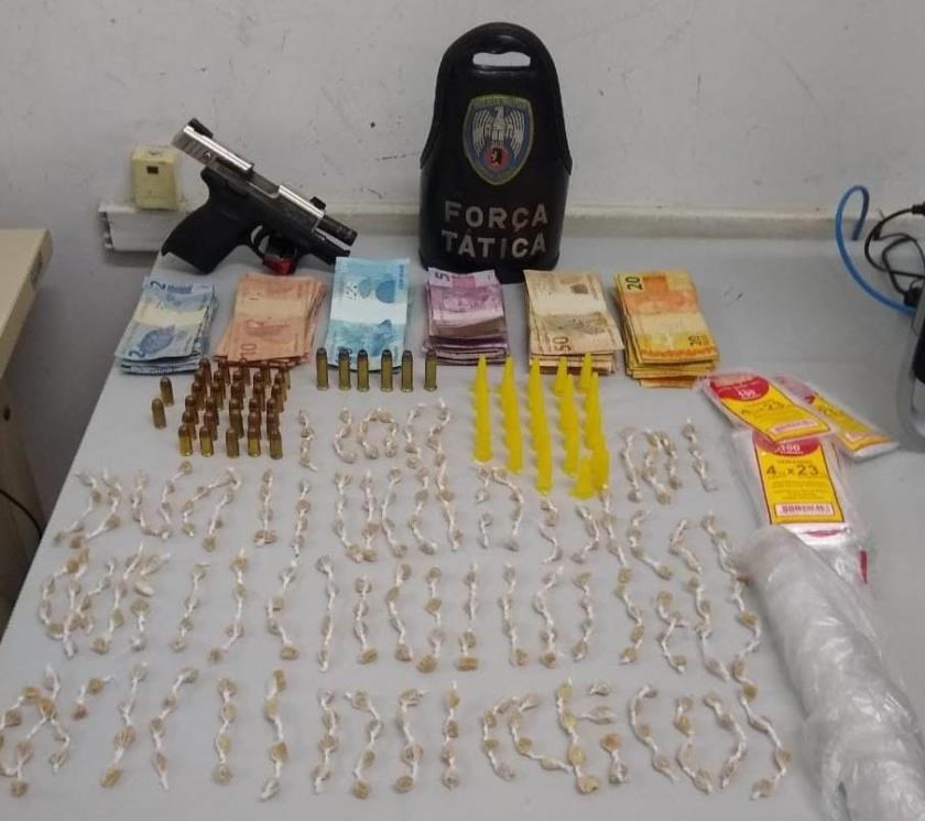No domingo (10), a equipe da Força Tática deteve duas pessoas e recolheu um revólver calibre 38 com cinco munições, 21 munições calibre 380, 500g de pasta base e cocaína, 573 pinos de cocaína, além de R$ 4.418,00 em espécie.
