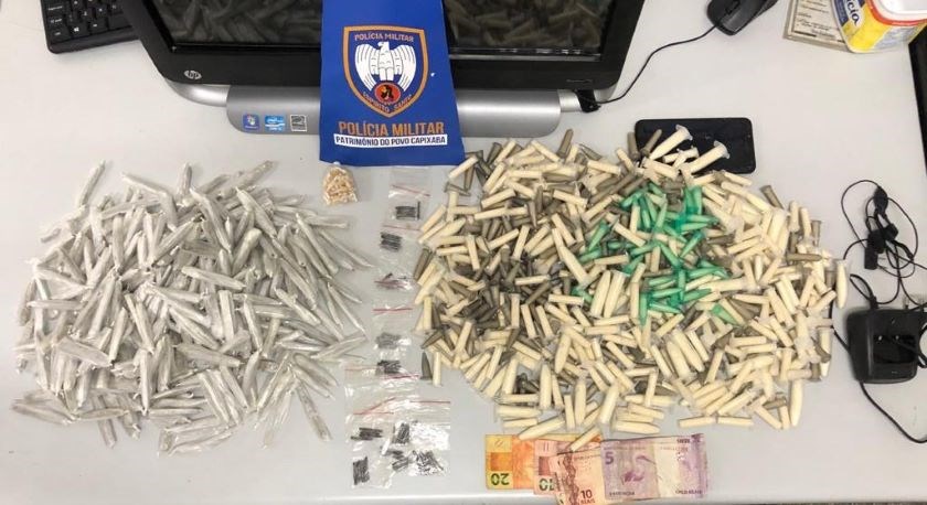 Já no domingo (24), policiais da Força Tática do 6º BPM receberam a informação de que suspeitos escondiam entorpecentes em um terreno baldio no bairro Jardim Bela Vista. Com o apoio da Companhia Independente de Operações com Cães (Cioc), foram localizados 581 pinos contendo cocaína; 264 buchas de maconha; 58 buchas de haxixe; 42 pedras de crack e R$ 70,00 em espécie. Um criminoso foi preso na ação.