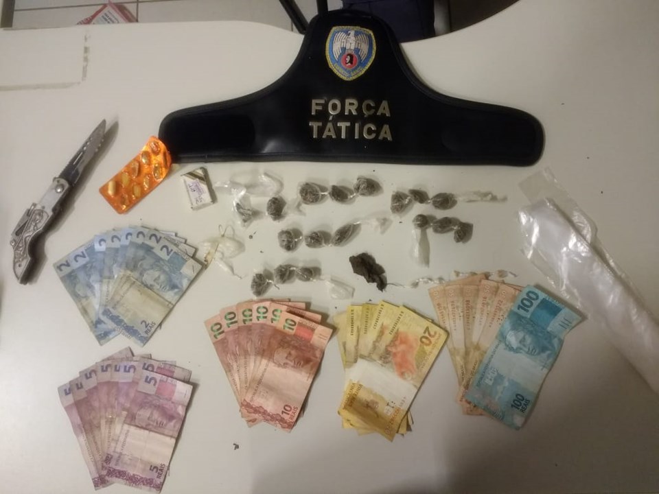 Nas proximidades do local foi realizada a abordagem a A.R.A., 23 anos e A.F.M., 22 anos, sendo encontradas 17 buchas de maconha e sete pedras de crack. Foram localizados também vários materiais para preparo e embalo dos entorpecentes.