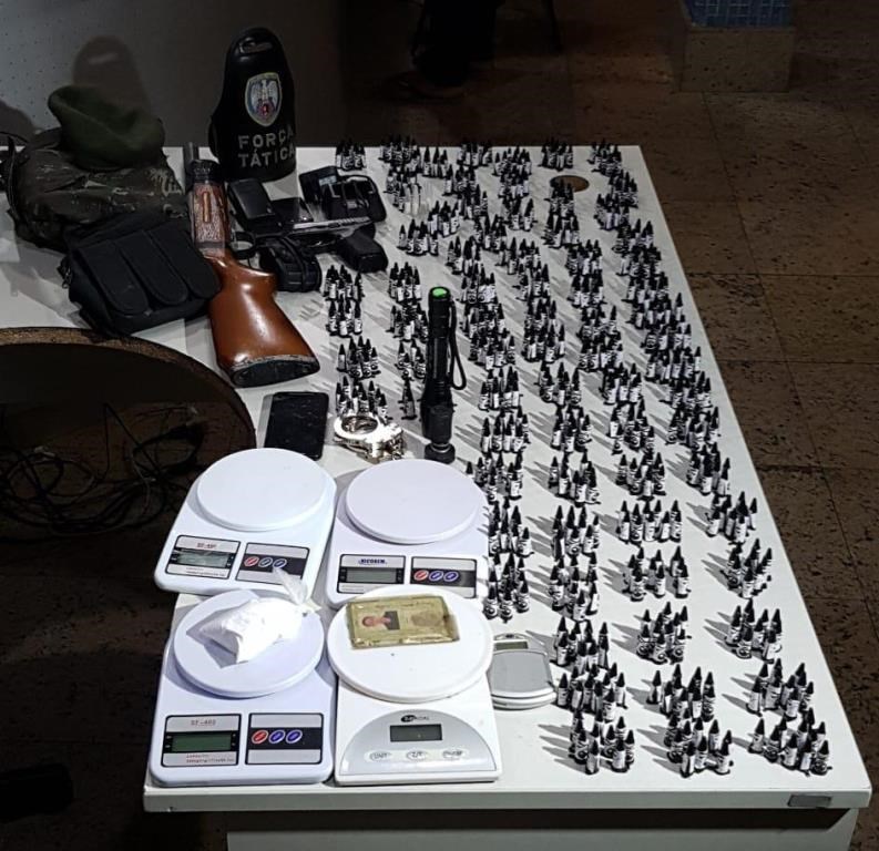 Os materiais apreendidos foram 750 pinos de cocaína; cinco balanças de precisão; uma boina do exército; uma lanterna; um jet loader; uma gandola camuflada (similar à do exército); um bornal de perna; duas bases para carregar rádio comunicador; uma bateria para rádio comunicador; um rádio comunicador marca Abell; uma algema; um celular; um simulacro de pistola modelo 24/7; uma espingarda calibre 12 , de fabricação caseira; uma sacola contendo uma substância indeterminada, de cor branca.