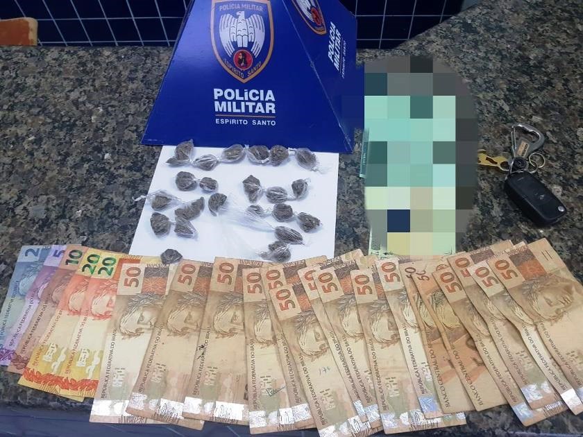 Os militares abordaram o veículo e apreenderam em seu interior 22 buchas de maconha e R$907,00. A dupla foi detida.