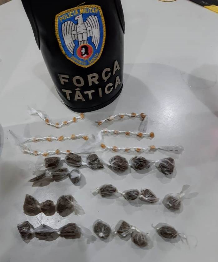 Por volta das 18h, a equipe de Força Tática estava patrulhando próximo as quadras gêmeas de Jabour, quando observou que um suspeito dispensou uma sacola em meio a algumas plantas e tentou despistar a guarnição. Momento em que foi dada voz de abordagem e foi realizada a busca pessoal. Nada de ilícito foi encontrado em posse do abordado, mas dentro da sacola foi encontrada em meio as plantas estavam 30 pedras de crack e 23 buchas de maconha.