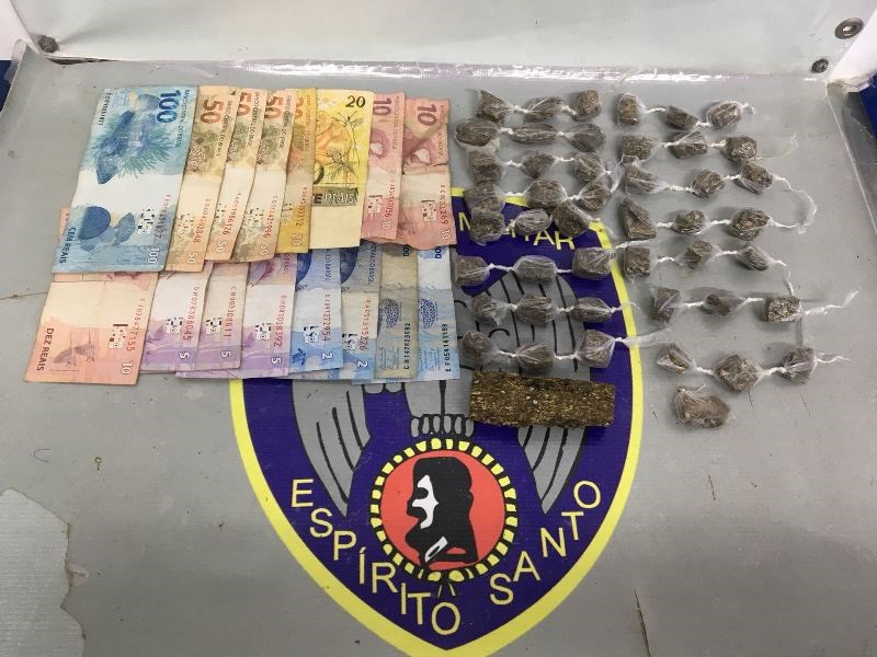 Após diligências e busca pessoal nos suspeitos, foram encontrados ao todo 46 buchas e um tablete de 35 gramas de maconha, R$ 354,00 em espécie e material utilizado para comercializar a droga.
