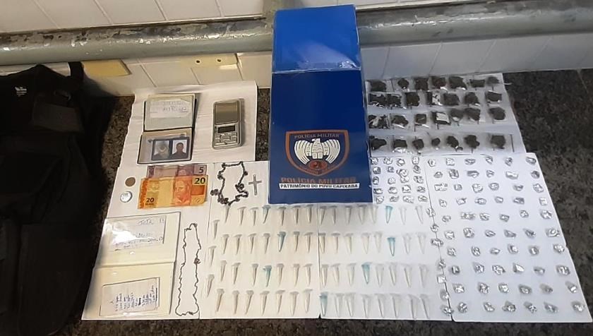 Por volta das 16h, policiais militares estavam em patrulhamento no bairro Ipiranga, quando avistaram um suspeito com uma mochila. Ao realizar a abordagem, foi encontrado dentro da mochila: 28 buchas de maconha, 63 pinos de cocaína, 87 pedras de crack, uma balança de precisão, uma capa de colete balístico e R$ 25,00 em espécie, além de anotações relacionadas à venda de entorpecentes. O suspeito foi apreendido.