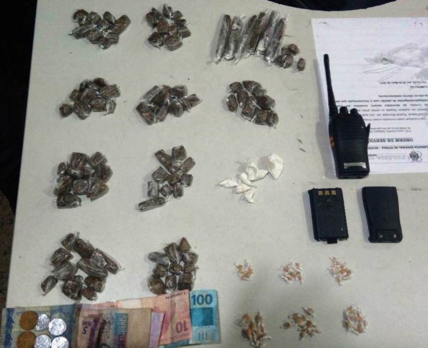 A ação aconteceu por volta das 21 horas durante o patrulhamento na região do bairro conhecida como chafariz. Os militares da guarnição avistaram um indivíduo em posse de um rádio comunicador e realizaram a abordagem. Com L.G.R.V., 13 anos, foram apreendidas 101 buchas de maconha, seis papelotes de cocaína, 56 pedras de crack, um rádio comunicador com duas baterias reserva e a quantia de R$ 129,50.