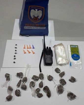 No bairro Olaria, por volta das 23h, policiais militares realizavam patrulhamento quando visualizaram alguns suspeitos que fugiram ao avistar a guarnição policial. No trajeto feito por eles, dentro de um quintal de uma casa, em um beco, foi encontrado um rádio de comunicação e uma bucha de maconha. Com apoio do cão farejador da PM, foi encontrada uma sacola contendo 22 buchas de maconha, sete bolas de haxixe, sete pinos de cocaína e materiais para embalo de entorpecentes.
