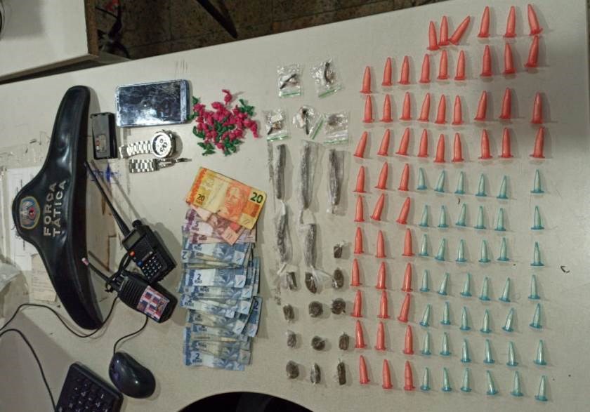 Foram recolhidos R$ 128,00 em espécie, 98 pinos de cocaína, 56 pedras de crack, 19 buchas de maconha, quatro unidades de haxixe, dois rádios comunicadores, uma bateria de rádio comunicador, um celular e um relógio.