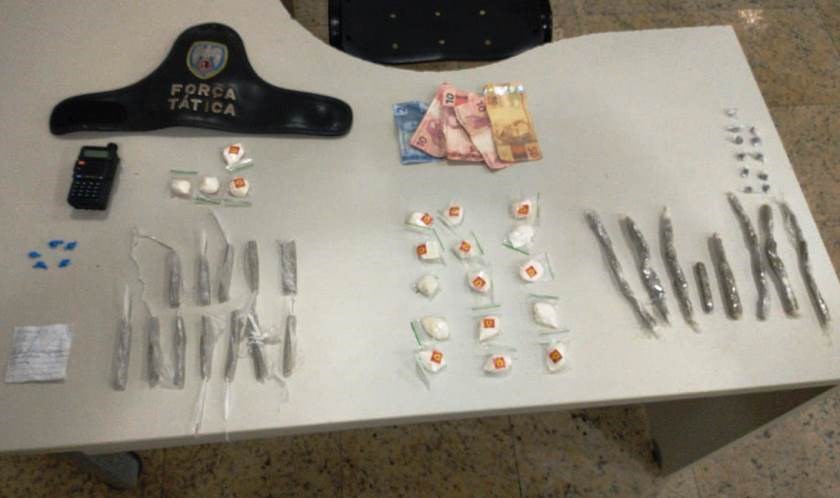 Durante o patrulhamento, os policiais avistaram um suspeito próximo ao campo do bairro. Ele foi abordado e em sua cintura foi localizada uma sacola contendo R$ 82,00 em espécie; cinco pedras de crack; 20 buchas de maconha; 19 papelotes de cocaína; 11 bolas de haxixe; um rádio comunicador e um papel contendo anotações do tráfico.