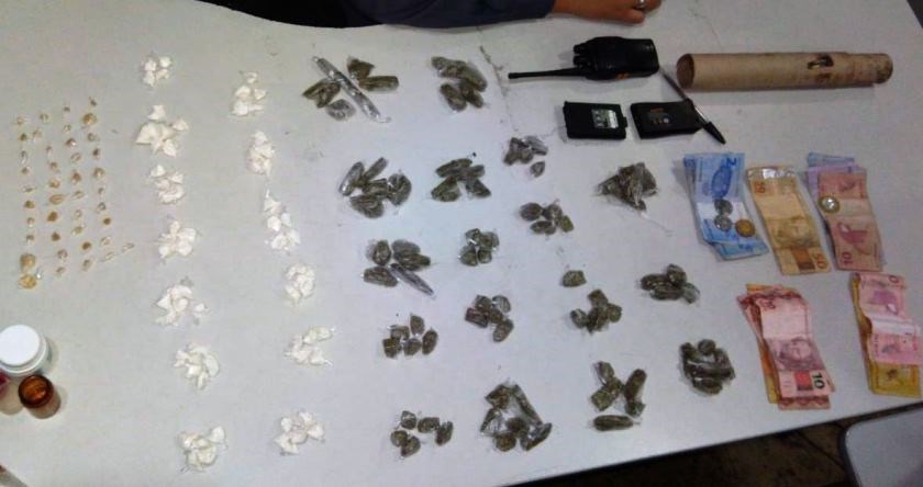 Durante patrulhamento a pé pelo bairro, os policiais visualizaram um suspeito com um rádio comunicador e um fogo de artifício em mãos, na Rua do Chafariz. Ao perceber a presença policial, ele tentou fugir, mas foi alcançado e detido. Na mochila do adolescente apreendido, identificado como L.C.S., 15 anos, foram encontradas 85 buchas de maconha, 64 papelotes de cocaína, 41 pedras de crack, um rádio comunicador com duas baterias extras e a quantia de R$ 219,25, em espécie.
