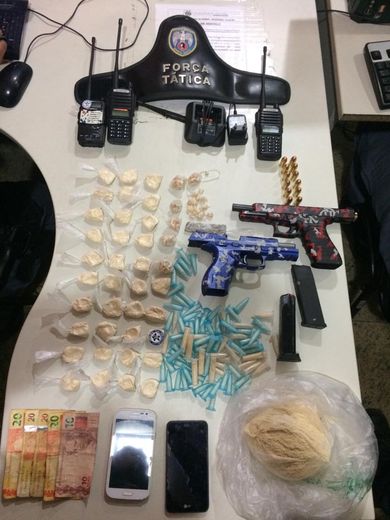 No local foi apreendida uma pistola Glock calibre 45, com 12 munições intactas, uma pistola calibre 380 com numeração raspada e carregador vazio, 85 pinos e 35 papelotes de cocaína, 78 pedras de crack, uma sacola contendo grande quantidade de cocaína, uma bucha de maconha, três rádios comunicadores, dois aparelhos celulares e R$ 90 em espécie.