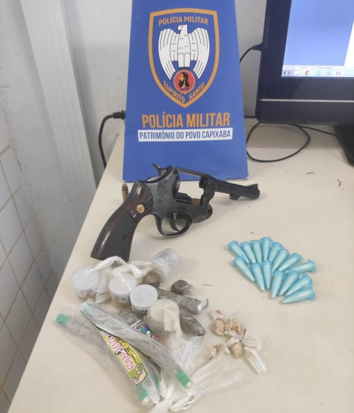 Durante patrulhamento no bairro São Domingos, militares da Força Tática visualizaram um suspeito jogando um objeto em cima de um telhado e correndo em direção a um beco. Após o suspeito ser abordado, ele informou que o objeto jogado tratava-se de um revólver calibre 38 com três munições. Além da arma, também foram encontrados e apreendidos no local 15 pinos de cocaína, 11 pedras de crack e 13 buchas de maconha.