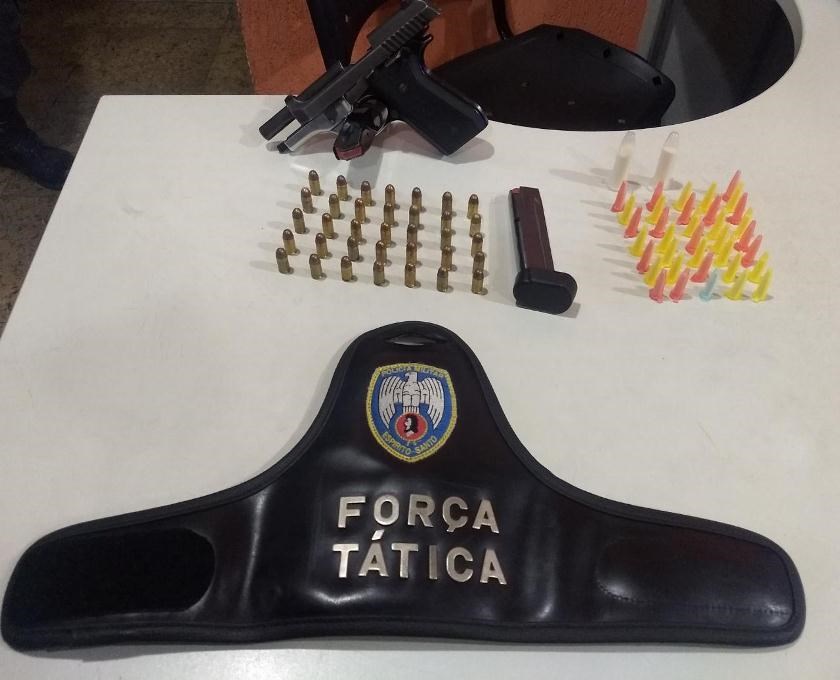 Já no bairro Alagoano, uma equipe da Força Tática realizava patrulhamento quando se deparou com um indivíduo que tentou empreender fuga. Com o rapaz, identificado como L.G.S., 20 anos, foi apreendida uma pistola Taurus PT58 .380, dois carregadores, 35 munições, 38 pinos de cocaína e um rádio comunicador.