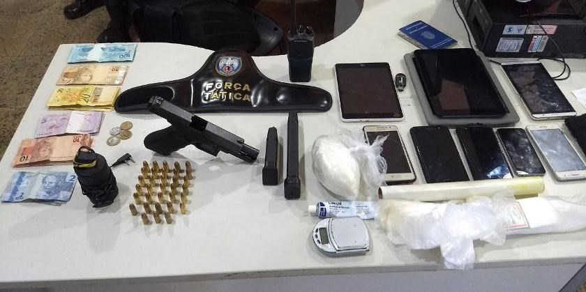 Com o rapaz detido foi apreendida uma pistola Glock 9 mm com seletor de rajada, dois carregadores e 33 munições de mesmo calibre. No interior da residência, também foram encontrados materiais para embalo de entorpecentes, um rádio comunicador, uma granada defensiva utilizada por forças de segurança, uma sacola contendo 200 gramas de cocaína, R$ 1.102,00 em espécie, quatro tablets e cinco smartphones.