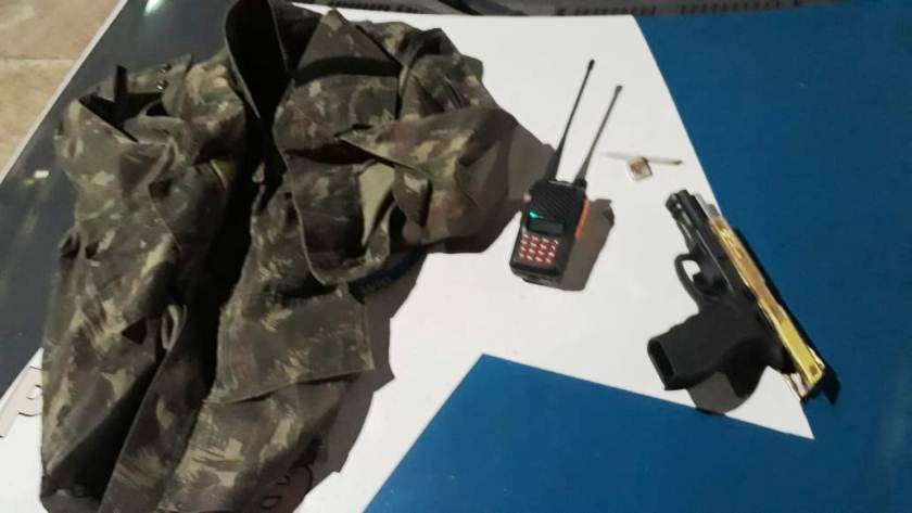 Na madrugada de domingo (27), no preventivo realizado no bairro Bonfim, foi avistado um veículo em alta velocidade avançando um semáforo. As viaturas acompanharam o automóvel e na abordagem foi apreendida uma bucha de maconha e uma pistola Taurus PT838 calibre 380 com numeração raspada e carregada com 15 munições, além de um rádio comunicador digital e uma farda do exército brasileiro. O nacional W.M.V, 24 anos foi detido e o veículo encaminhado à delegacia.