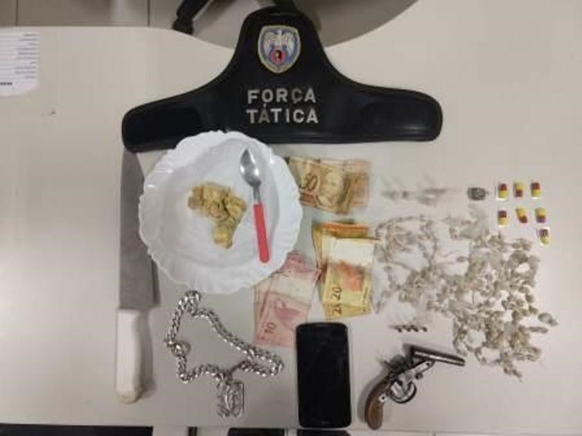 Em Iúna, a equipe da Força Tática atendeu uma denúncia de tráfico de entorpecentes no bairro Quilombo. No local foram abordados F.H.T. e W.S.R., resultando na apreensão de 196 pedras de crack, 50 gramas de maconha, uma garrucha calibre 22 com quatro munições, materiais para preparo e embalo das substâncias e R$ 170,00 em dinheiro trocados. Os dois envolvidos com o tráfico foram conduzidos, juntamente com o material apreendido, até a Delegacia de Polícia Civil de Venda Nova do Imigrante.
