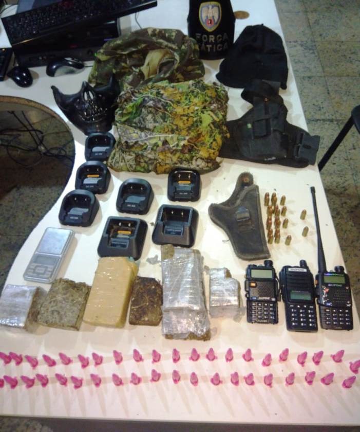 Dentro da residência foram apreendidos seis tabletes de maconha; 43 pinos de cocaína; 22 munições calibre 9 mm; três rádios comunicadores e sete bases para carregamento; dois coldres de arma de fogo; uma touca ninja; uma blusa camuflada; uma jaqueta camuflada; uma máscara e uma balança de precisão. Ninguém foi preso.