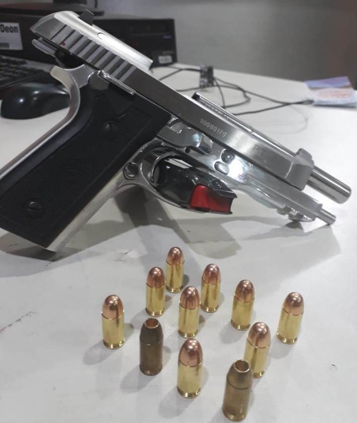 Já na madrugada, os militares receberam a denúncia que um homem estaria armado na região da Laminha. Dentro da loja de conveniência de um posto de gasolina foi realizada abordagem A.A.N.C., 33 anos. Em sua cintura foi encontrada uma pistola modelo PT59, calibre .380, um carregador e nove munições .380 intactas.