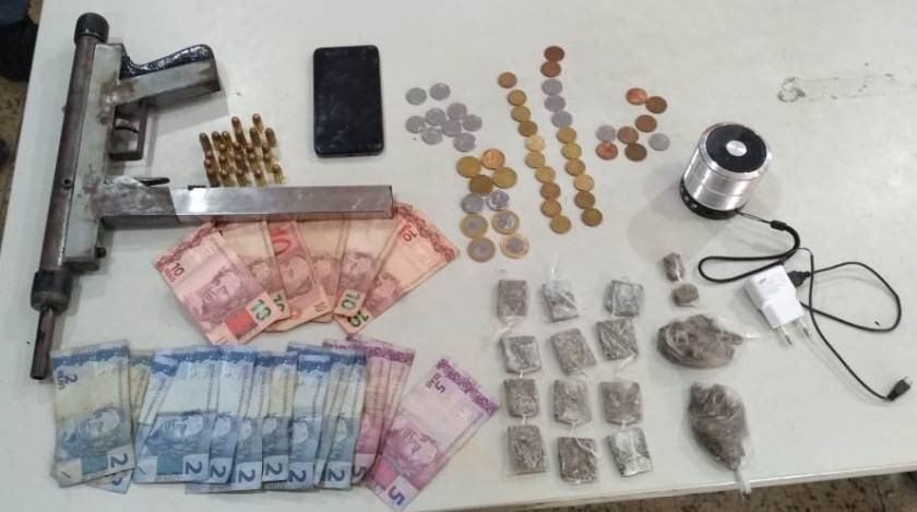 Na tarde de domingo, durante patrulhamento preventivo realizado em Nova Palestina, na região conhecida como “buraco quente”, foram identificados pela guarnição indivíduos que tentavam fugir ao perceber a presença policial. Dentro de uma residência, onde um dos suspeitos entrou, foi apreendida uma submetralhadora de fabricação artesanal, um carregador com 23 munições calibre 380, 16 buchas de maconha e uma pequena quantia em dinheiro.