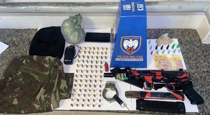 Policias militares do 10º Batalhão apreenderam uma submetralhadora com laser e 82 munições calibre 380, no município de Guarapari. Outros materiais também foram localizados. A ação ocorreu na noite da última terça-feira (19).